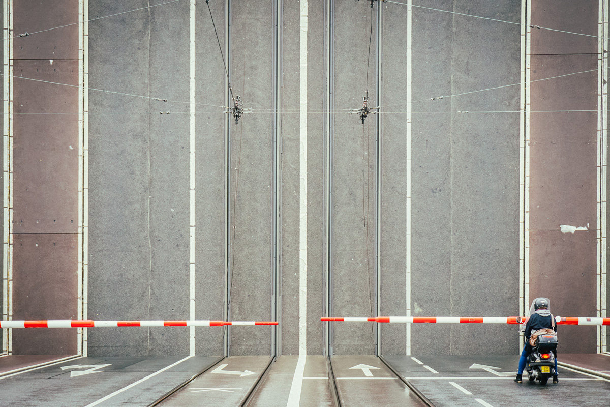 Luca Pot d'Or schafft es ebenfalls mit seinem Foto auf den ersten Blick absolute Verwirrung zu erzeugen. Er macht aus einer einfachen, normalen Situation auf der Straße mit einer Klappbrücke ein sehr ausdrucksstarkes grafisches Bild, das ohne Erklärung für die optische Wahrnehmung keinen Sinn macht. Ein Rollerfahrer bleibt vor einer „Betonwand“ stehen und wartet. Es sieht aus als würde die Straße einfach 90° nach Oben in Richtung Himmel weiter führen, was natürlich für den Fahrer nicht zu bewältigen ist. Luca hat genau den richtigen Ausschnitt des Fotos getroffen und die Details so dargestellt, dass dieser entscheidende Moment so interessant ist und mit dem dritten Platz in unserem Fotowettbewerb belohnt wird. Jedes Element, jeder weißer Streifen, jeder Fleck auf dem Beton macht die Aufnahme real und ästhetisch attraktiv. Sobald verstanden wird, was abgebildet ist, „wartet“ der Betrachter mit dem Fahrer auf die Brücke. „Das Foto entstand in Amsterdam an einer Klappbrücke und war eine wortwörtliche Momentaufnahme, da ich weder mit der Beweglichkeit der Brücke noch mit einem solchen Blickwinkel gerechnet habe.“, sagt er.