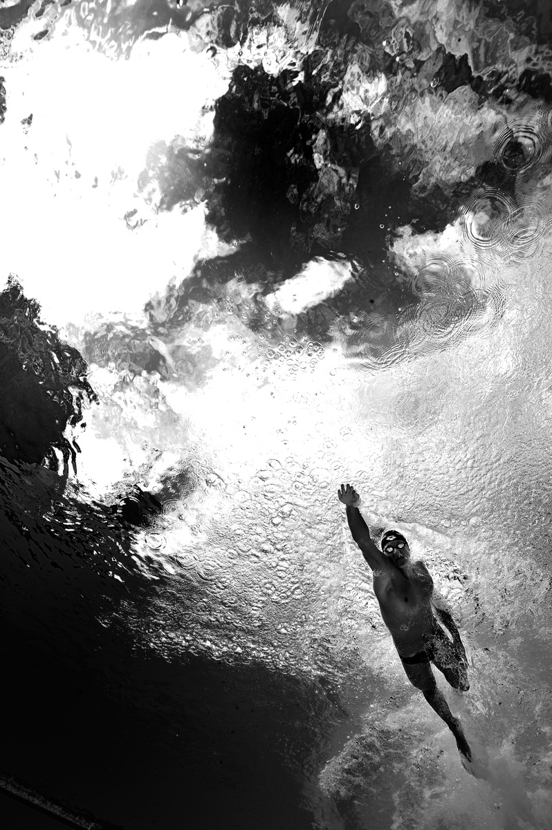 Unser fünfter Platz ging an Eckhard Krumpholz aus Limburg. Er zeigt uns mit seinem dynamischen Foto eine außergewöhnliche Herangehensweise der Unterwasserfotografie. Sein Motiv: Ein Schwimmer, der aus der untersten Ecke des Bildes fast wie ein Superheld durch das Wasser schießt. „Es entstand im Sprungbecken des örtlichen Freibads. Ich hielt auf etwa 4m Wassertiefe die Luft an und wartete auf den Schwimmer, der die Aufgabe hatte über mich hinweg zu kraulen.“, schreibt Eckhard. Das Tageslicht funktioniert in dem Bild als Gegenlicht und es ist fast nur die Silhouette der Person zu erkennen. Alle Wolken und Farben die über der Oberfläche existieren zeigen sich wie ein verschwommenes Meer aus Struktur und Luftblasen und spiegeln sich auch in der Schwimmbrille.
