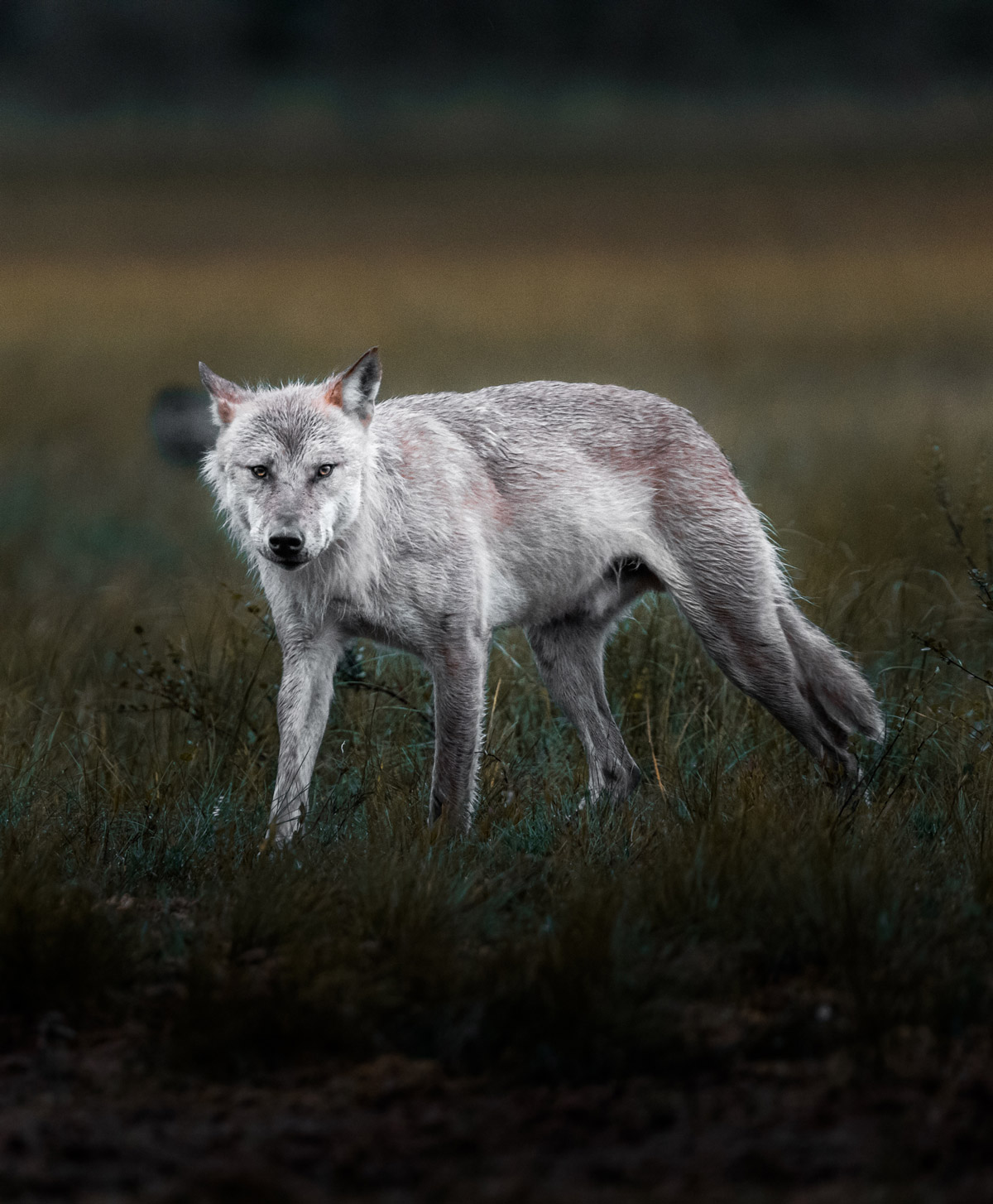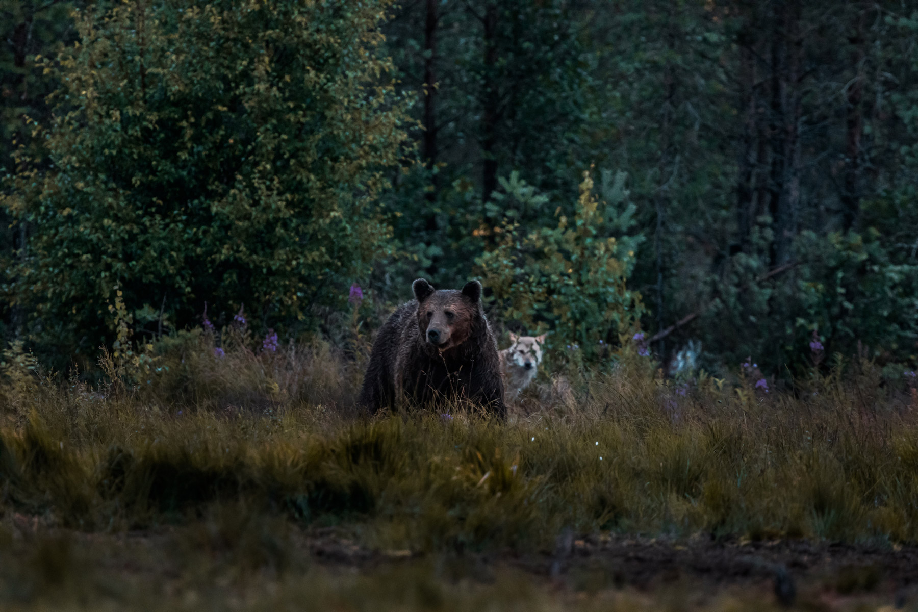 Immer wieder sah ich Bären, die den Sumpf in Richtung Wald überquerten. Dann der wohl atemberaubendste Moment des Abends. Abends? Ja richtig! In Skandinavien ist es besonders lange hell, und Dunkelheit tritt nur kurz ein im Sommer. Die Mitternachtssonne ist also der beste Begleiter eines Fotografen in Skandinavien. Was bescherte mir also das immer noch ausreichende Licht zum Fotografieren? Ich schaute durch den Sucher meiner Canon und konnte meinen Augen nicht trauen. Ein Braunbär am Waldrand und hinter ihm die Wölfin, die in seinem Schatten hervorschaute. Ich konnte mein Glück kaum fassen und drückte ununterbrochen auf den Shutter der Kamera. Anschließend genoss ich den Moment, denn das ist es letztendlich worum es sich geht, den intimen Moment mit diesen einzigartigen und wunderschönen Geschöpfen voll auszukosten.